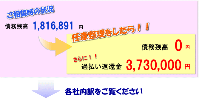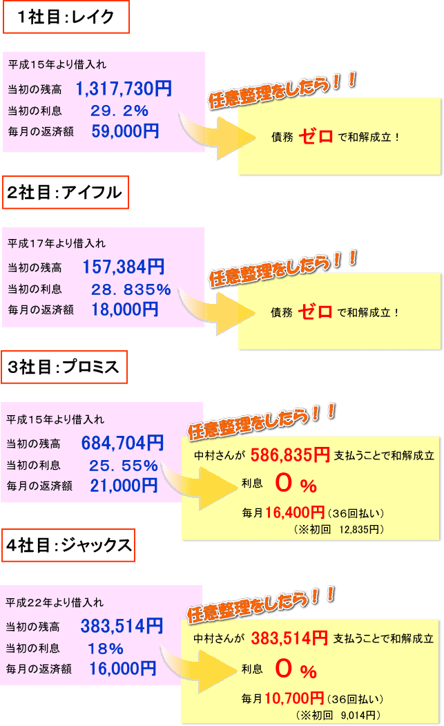 中村さんは、レイク、アイフルに対して、20%後半の高い利息で、5年以上もの間、借入れと返済を繰り返されていたため、多額の利息の払い過ぎがありました。そのため、中村さんのレイク、アイフルに対する借金はゼロにすることができました。