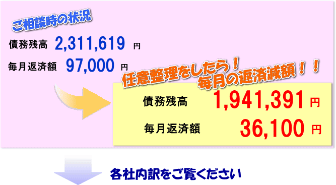 また、プロミス、レイク、楽天KC、エポスカードに対しては、法定の利息内での取引であったので、借入残高はあまり減少しませんでしたが、今後の利息を0%に変更し、毎月の返済金額も5社合わせて36,100円にまで減額することができました。