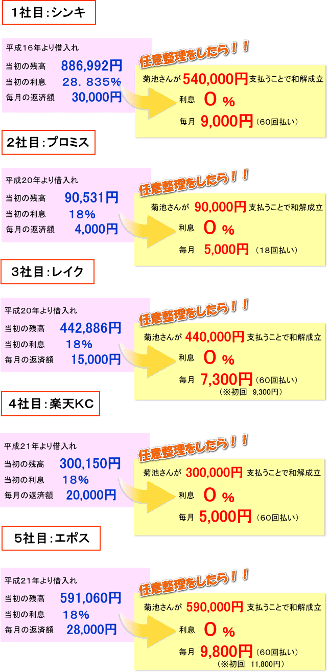 菊池さんは、シンキに対して、20%後半の高い利息で、5年弱の間、借入れと返済を繰り返されてきたため、利息の払い過ぎがありました。そのため、菊池さんのシンキに対する借金は30万円ほど減額することに成功しました。