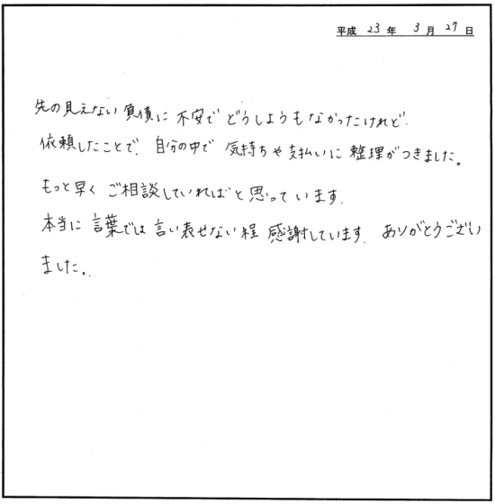 もし、高い利息で返済をしている場合や、毎月の支払いが苦しい時は、ぜひ一度、ご相談いただきたいと思います。